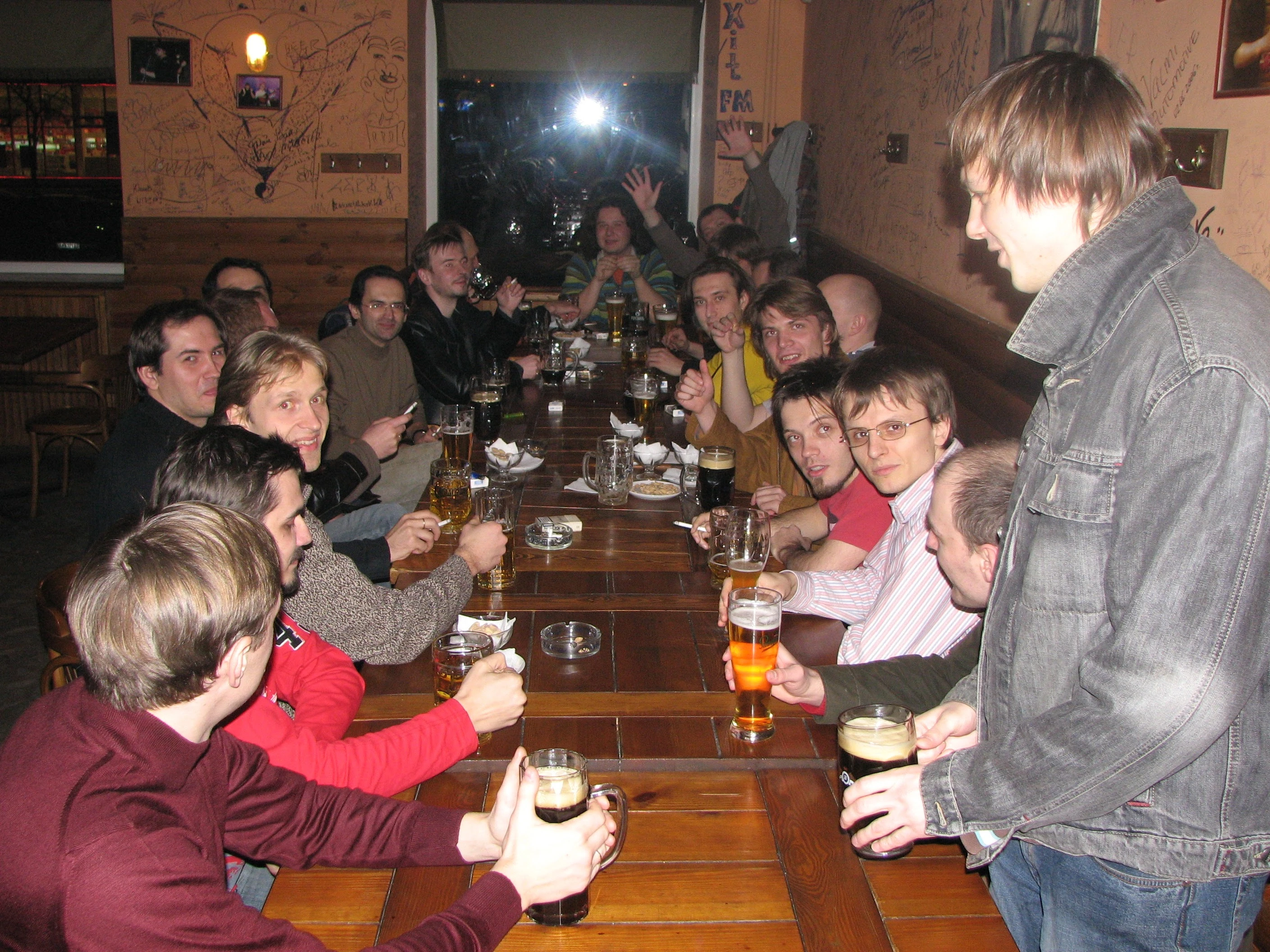В том баре на стенах местным «знаменитостям» разрешается что-то писать. Ну, собственно, в середине вечера мы решили, что логотип S.T.A.L.K.E.R. будет хорошо смотреться на их стене. Администрация заявила, что разрешено это только знаменитостям. Пришлось объяснить, что предыдущих «знаменитостей» в лучшем случае знает Украина… «А вот те сорок скромных и не очень броских ребят сделали то, что скоро будут знать во всем мире»… Я был убедителен :)