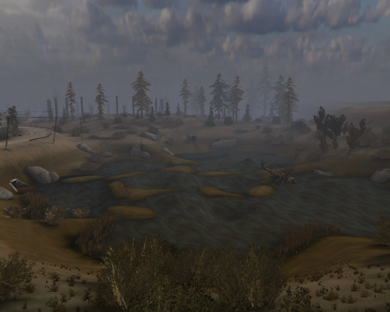 В топях, в дальнем их конце, находится один из упавших вертолётов. Топь представляет собой болото с кочками, вода которого покрыта химическими аномалиями-минами (в стороне от основных маршрутов находятся декоративные гравитационные аномалии). Передвигаясь по кочкам, игрок добирается до вертолёта, и, невдалеке, находит несколько вынесенных из вертолёта ящиков (один из ящиков содержит в себе немного припасов).