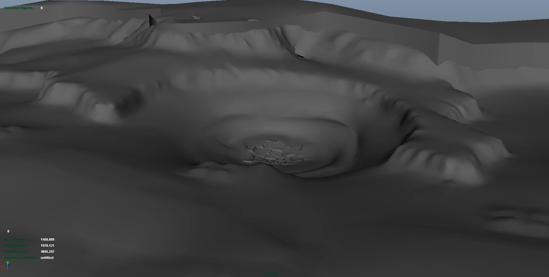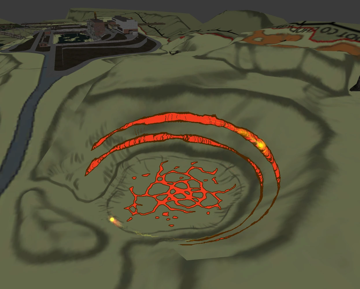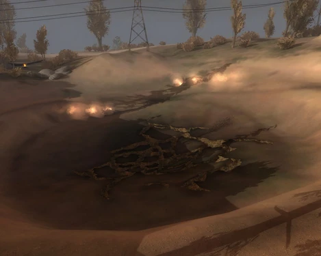 В неглубоком кратере в центре находится гравитационная аномалия, вокруг которой двумя концентрическими кругами выжжены канавы. В канавах, в противоположную друг от друга сторону летают аномалии fireball. Всё место накрыто огненным полем. Артефакт, рождающийся в аномалии, должен прыгать по пути, проходящему по внутренней канаве. Во внешней канаве летает огненный полтергейст в combat_ignore[4], который становиться агрессивным, когда игрок подходит к центру аномалии ближе, чем полпути между двумя канавами.