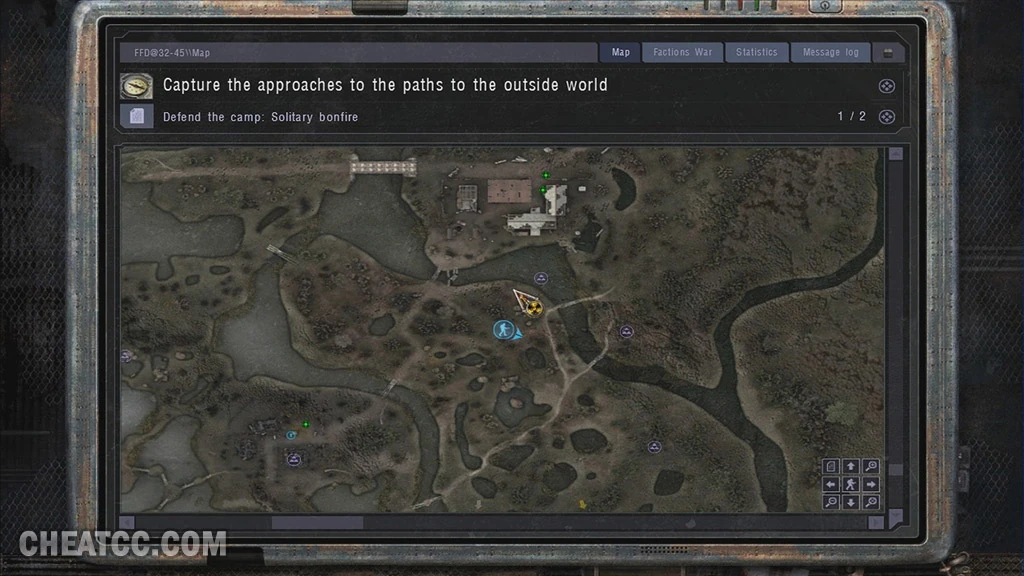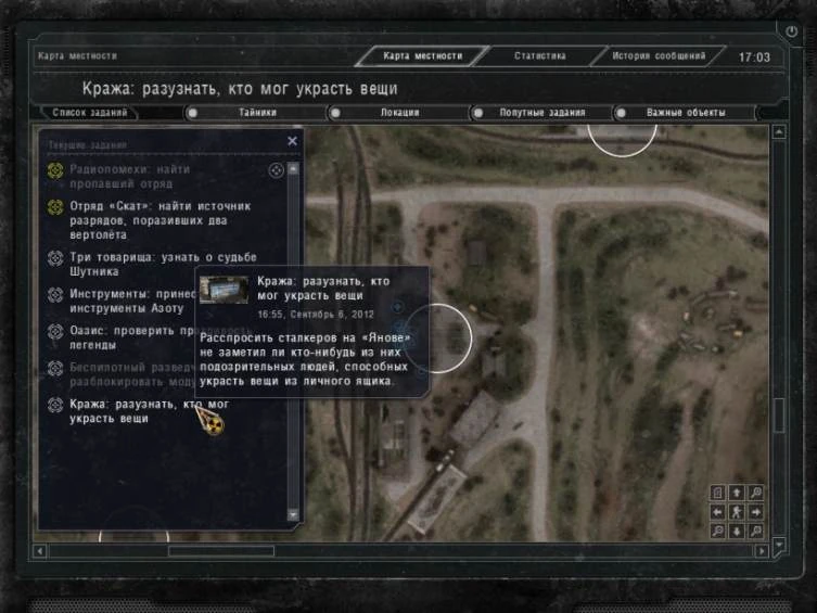 - Карта — 1-ый раздел КПК, также содержащий в себе список заданий. По сравнению с КПК Меченого появились кнопки легенды, передвижения карты; задания делятся на основные и побочные, последние не имеют своей иконки. В это разделе присутствует отображение передвижения мутантов и сталкеров, как друзей, так и нейтралов и врагов;
