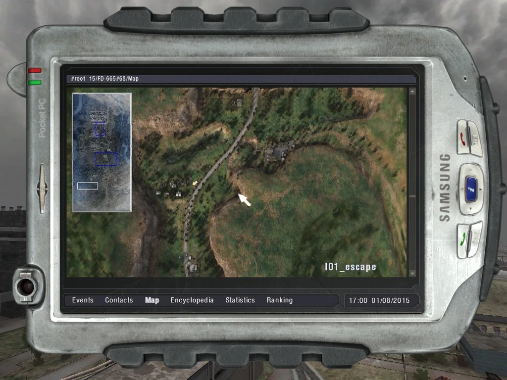 - План[3] — 2-ой раздел, содержащий в себе всю карту Зоны. Имеет кнопки максимального отдаления, центрирования на на самом КПК, масштабирования («+» и «-»). В поздних имелась кнопка, позволявшая ставить свою метку на карту. К 2007 году она была вырезана. Несколько раньше карта делилась на локации, то есть отображалась не вся карта, а только выбранная локация[4]. В самых ранних стадиях разработки на карте отслеживались перемещения мутантов, сталкеров и даже техники, но это было реализовано только в качестве теста. Является одним из первых созданных разделов;