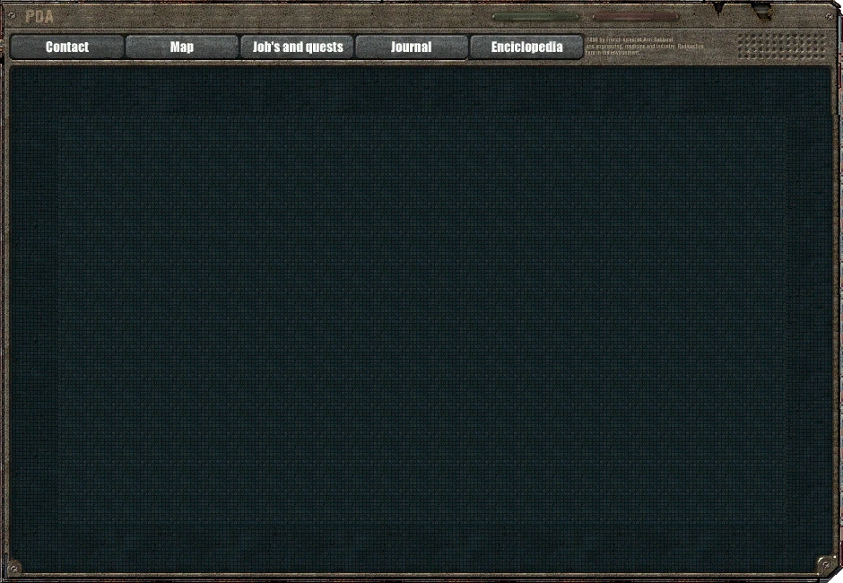 - Справка[8] — последний раздел, содержащий информацию по миру Зоны: об артефактах, аномалиях, локациях, группировках и прочем. Имеет «заблокированные» пункты[9], которые становятся открыты после изменения скриптового файла. Является одним из первых созданных разделов.