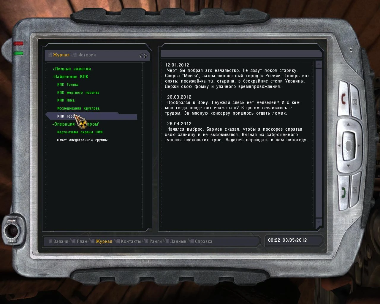 - Журнал[5] — следующий раздел, делящийся на 2 подраздела: «Журнал» и «История». 1-ый содержит необходимую информацию из чужих КПК и заносящуюся самим Меченым; 2-ой раздел — историю сообщений на КПК и диалоги Меченого. Вполне возможно, что этот раздел, помимо имеющихся функций, планировался как «реальный» дневник игрока;