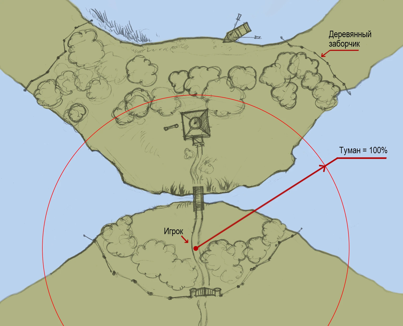 Это маленький островок-холм, окруженный водой и окутанный густым туманом. Игрок видит покосившуюся деревянную церквушку, силуэты деревьев и, прямо перед собой, деревянный мостик через заросший камышом ручей. На куполе церкви установлена радиоантенна, явно ручной сборки, вроде как телевизионная, для дециметровых волн. Картограф находится внутри церкви, он удивительный человек. Он чувствует проходы Зоны и может свободно входить и выходить из пространственных пузырей.